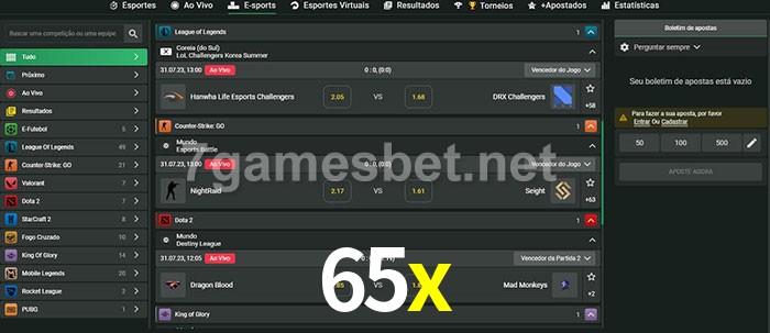 O 65x oferece uma grande seleção de opções de apostas em e-sports com probabilidades competitivas